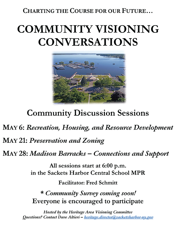 Share your vision for the future of Sackets Harbor at this third of three Community Visioning Conversations on Thursday, May 28, at 6 pm, at the Sackets Harbor Central School’s (SHCS) Multi-Purpose Room (MPR), at 215 South Broad Street.